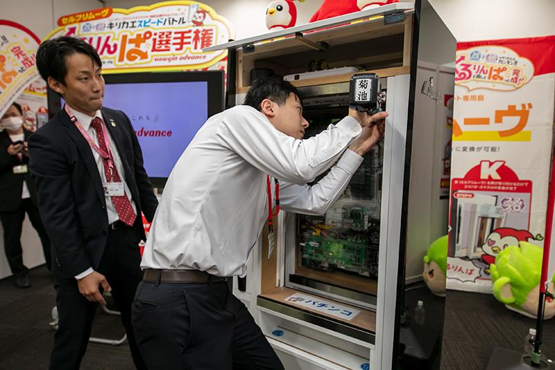 当日は「くるりんぱ選手権」と題して、参加ホールのスタッフが『セルフリムーヴ』の木枠の入れ替えスピードを競うコーナーを用意。同製品の魅力を伝えるとともに、ステージ裏では熱い戦いが繰り広げられていた。