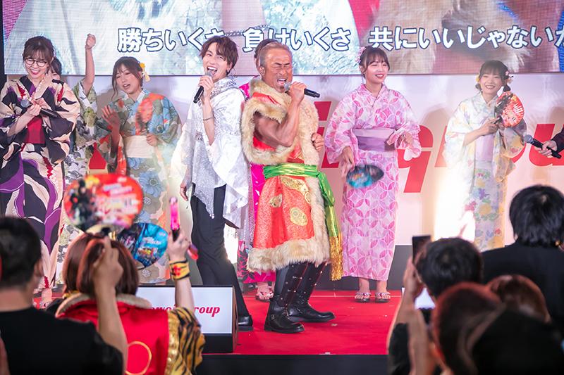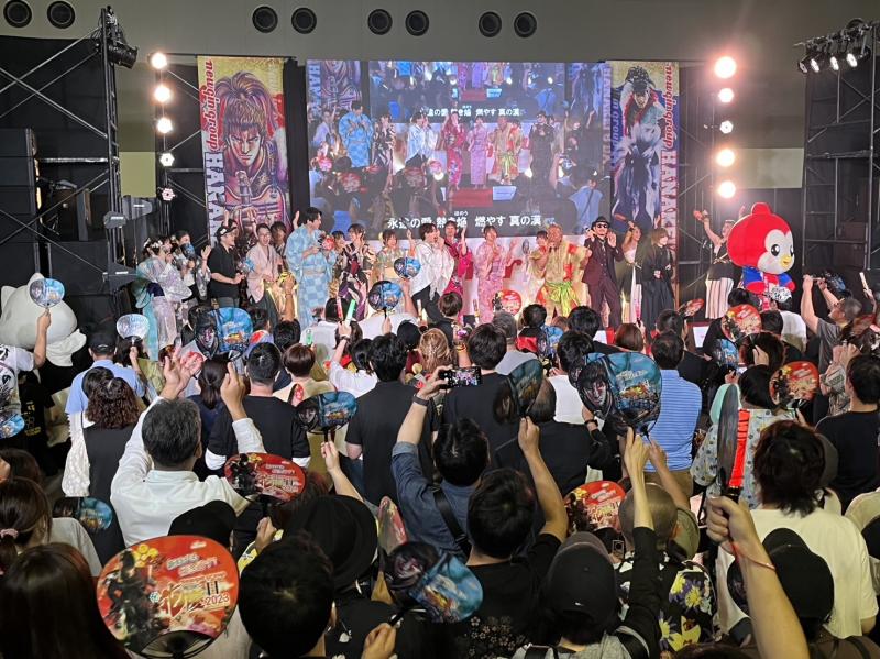 定番の花慶LIVEには、お馴染みの角田信朗さん、大西洋平さん、前田慶次のCVを務める声優の藤沢としやさん、さらに花の慶次シリーズ最新機種『e花の慶次 裂 一刀両断』の搭載曲を歌うナノさんが登場。コロナ禍が終息の兆しを見せるなか、約4年ぶりの“声出し解禁ライブ”とあって例年にない大盛り上がりを見せた。