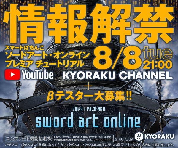 KYORAKUは8月8日の午後9時から、公式YouTubeチャンネルで「スマートぱちんこ ソードアート・オンライン」の新機種発表先行動画(プレミア・チュートリアル動画)をプレミア公開する。
