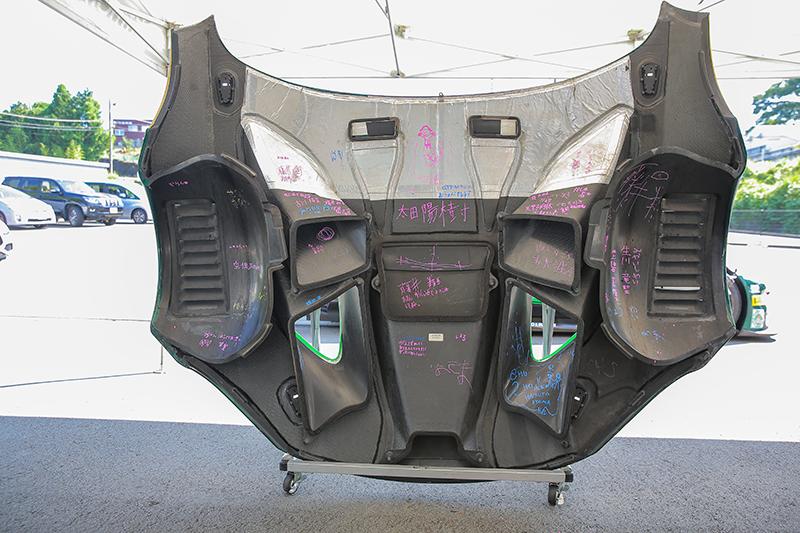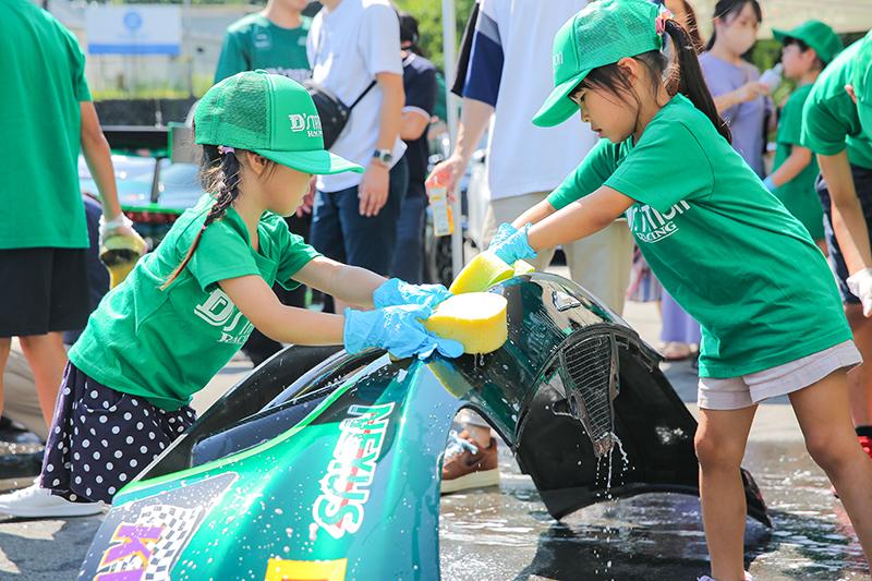 子どもたちには、本物のレーシングマシンに直に触れた経験が夏休みの思い出として刻まれ、レーシングマシンのボンネット裏には子どもたちの名前や応援メッセージが刻まれた。