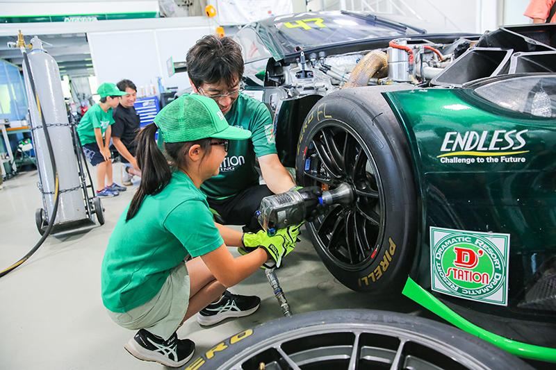 参加した子どもたちは、工場見学でチームメンバーの仕事ぶりを目の当たりにしたほか、マシン整備でタイヤを交換したりエアロパーツを掃除したり。エンジンの始動点検もおこなった。