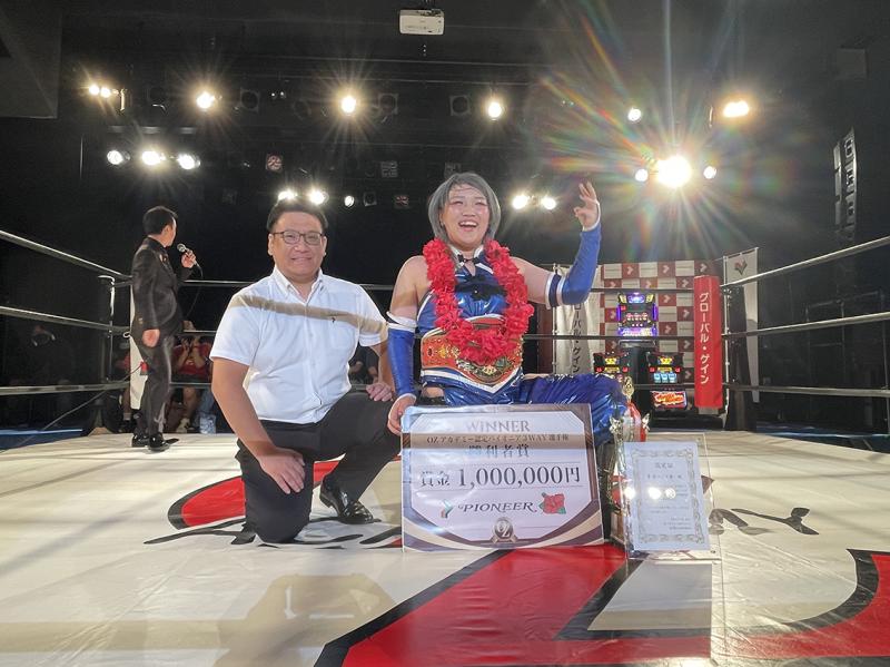 第三試合のOZアカデミー認定パイオニア3WAY選手権では、青木いつ希選手が第6代王者に輝いた。プレゼンターはパイオニアのパイオニア広報の田上真助さんが務めた。