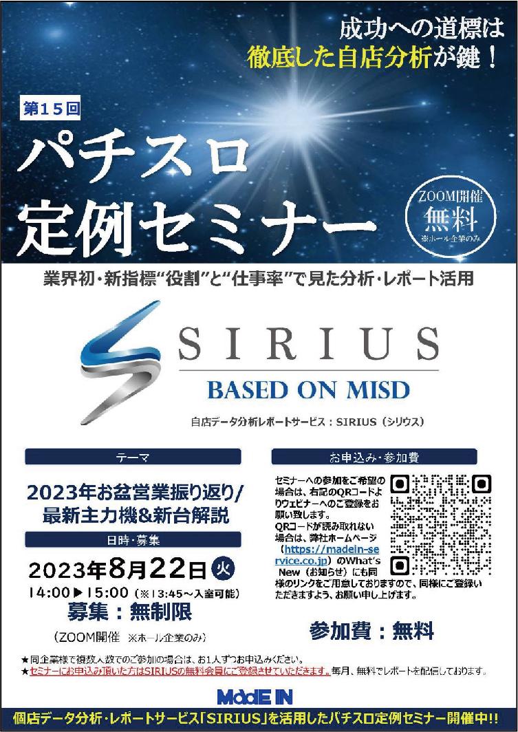 パチスロ運用に特化したコンサルタント企業、メイドインサービスの第15回パチスロ定例セミナーが8月22日(火)にオンラインで開催される。毎回好評のこのセミナーでは、個店ごとの戦略構築を支援する同社の分析サービス「SIRIUS」(シリウス)のデータをもとに最新市場動向を解説。設定シミュレーションソフト「MMP」も加えて新台の特徴や設定運用のポイントを伝えている。