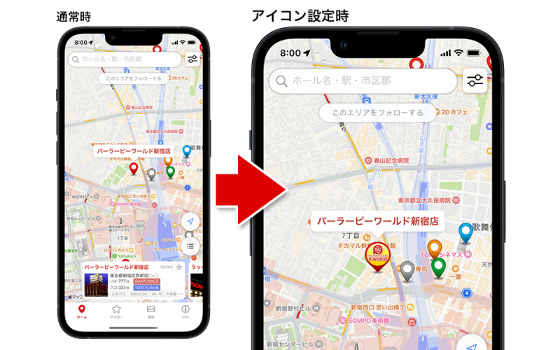 「MAPアイコン」を設定すると、『PーWORLD パチンコ店MAP』上のピンに自店のロゴや外観画像などのオリジナルのアイコン画像を登録でき、アイコンサイズは通常のものと比較して約4倍になる。地図上で他店との差別化を図れるツールになりそうだ。