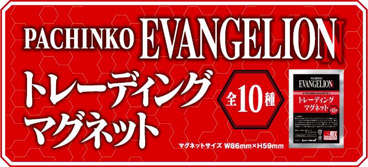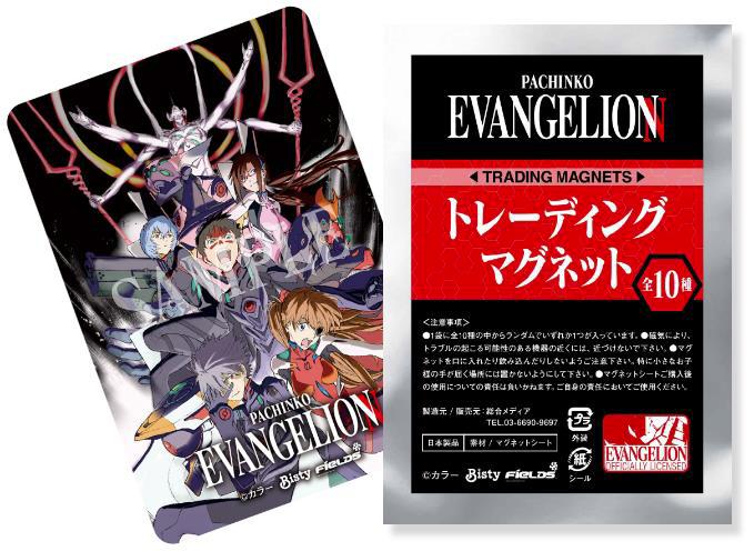 このトレーディングマグネットは、シリーズ機全体を盛り上げるための取り組みの一つ。パチンコエヴァンゲリオン用に描き下ろしたオリジナルのビジュアルをマグネットにプリントしたもので、1袋に全10 種の中からランダムでいずれか1つが入っている。