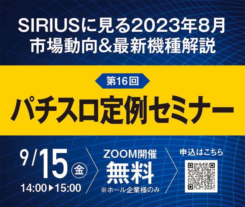 今回のテーマは「SIRIUS に見る 2023 年 8 月市場動向&最新機種解説」。8月市場の振り返りとともに、9月前半までに登場した新機種を中心に続々と登場するスマスロ新台や6.5号機の実績を分析し、今後の市況変化と要因を予測する。市場の最新トレンド や旬な新台の動向などを把握できる、必見のWEB セミナーだ。