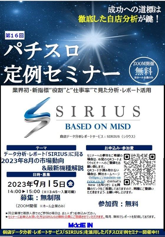 業界初の新指標を用いた自店舗実績データ分析・レポートサービス 『SIRIUS(シリウス)』を提供するメイドインサービスが、無料で開催しているパチスロ定例セミナーが9月15日(金)にオンラインで開催される。