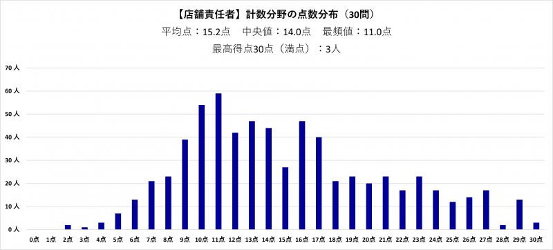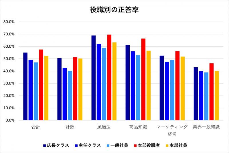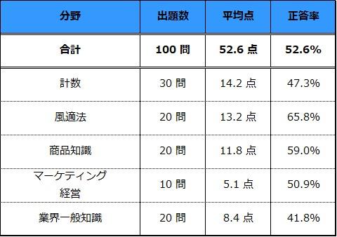 今回の受験企業数は114社、受験人数は1221人。分野別平均点と正答率、役職者別の成績、店長クラスの計数点数分布をそれぞれグラフで表した。