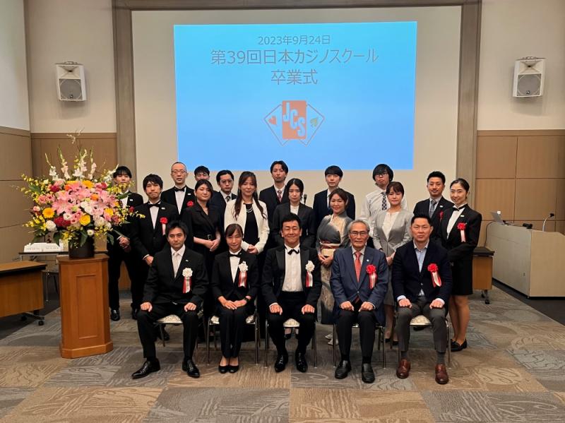 日本カジノスクール東京校は9月24日、都内の主婦会館プラザエフ(千代田区)で第39期生の卒業式を開催した。出席したのは国際ゲーミング学科の「総合短期集中3カ月コース」「総合1年コース」「総合フリーコース」「カジノスーパーバイザーコース」の第39期卒業生8人と、既卒者1人(第37期卒業生14人の中の1人)の計9人。対面での卒業式開催は3年ぶりとなる。
