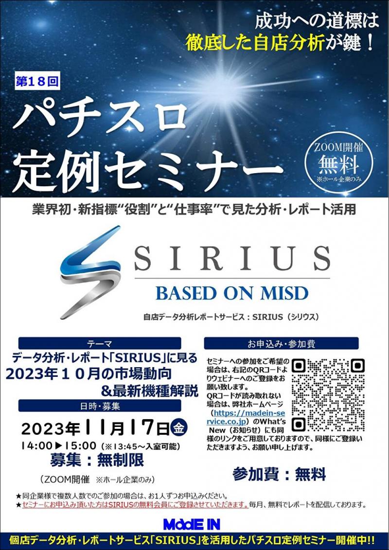 業界初の新指標を用いた自店舗実績データ分析・レポートサービス 「SIRIUS(シリウス)」を提供するメイドインサービスは11月17日(金)、パチスロ定例セミナーをオンラインで開催する。毎月好評の同セミナーは、申し込みだけで無料視聴が可能だ。