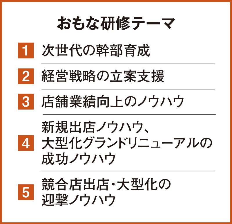 アミューズ・ファクトリーが提供している研修テーマは5つに大別できる。第1に、「次世代の幹部育成」のための研修で、これは副店長クラスを対象としたもの。いつの時代でも求められる普遍的なテーマだ。第2に部長~役員層対象の「経営戦略の立案支援」、第3に部長~店長対象の「店舗業績向上のノウハウ」、第4に本社幹部~店長対象の「新規出店ノウハウ、大型化グランドリニューアルの成功ノウハウ」、第5に店長対象の「競合店出店・大型化の迎撃ノウハウ」だ。この第2、第3の支援の必要性の背景には、「業界の現状の認識」がある。