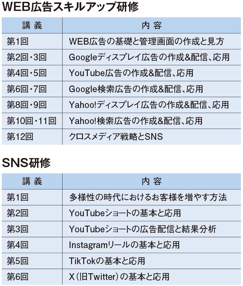 同社の『Web広告スキルアップ研修』は全12回、『SNS研修』は全6回が標準的で、いずれもオンラインで実施している。研修では基礎を学んだ後、各人に少額の予算を持ってもらい、広告を「誰」(ターゲット)に見せるか、「どこ」(配信地域)で見せるか、「何」(広告の種類)を見せるか、「どういう内容を」を見せるかなどを立案し実践してもらう。その成果をレビューしながら改善していくことを繰り返して、効果的な運用を学んでもらう。