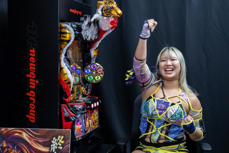スターダム公式YouTubeチャンネルで配信される、最新機種『Lパチスロ花の慶次〜佐渡攻めの章〜』のスペシャル企画には、スターダムから林下詩美選手、渡辺桃選手、舞華選手、MIRAI選手の4人が参戦。トーナメント形式で、ATのループバトルなど人気シリーズの魅力を堪能した。最初はぎこちなかった手つきが、徐々に上手くなっていく様子も本企画のポイント。熱戦の模様は3回に分けて配信予定だ。