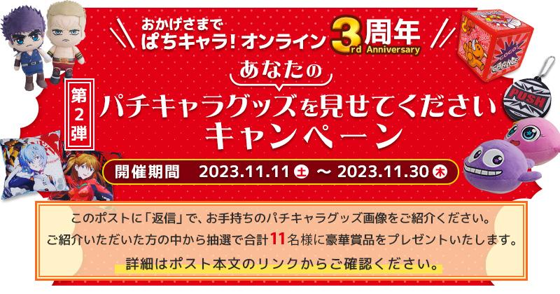 キャンペーンは「あなたのパチキャラグッズを見せてくださいキャンペーン」を実施。ぱちキャラ!オンライン公式X(旧Twitter)から応募できるもので、キャンペーンのポストに自身が持つパチキャラグッズを画像付きで返信するだけ。返信の中から抽選で、「海物語 クジラッキーminiぬいぐるみ」や「サミー セブンフラッシュ サウンドキーホルダー」など、7アイテムを11人にプレゼント。期間は11月30日まで。