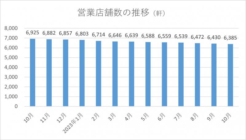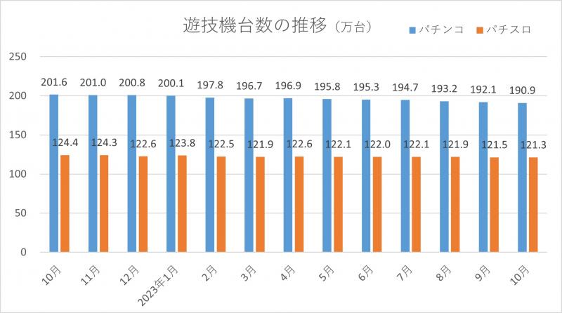 2023年11月16日No.10003950 全日加盟営業店、10月末時点で6385軒 全日本遊技事業協同組合連合会が集計した組合加盟店舗の実態調査によると、10月末時点の営業店舗数は6385軒で、前月より45軒(0.7%)減少した。新規店舗数は1軒、廃業店舗数は65軒、当月中の休業店舗数は19軒。 パチンコ遊技機台数は190万9496台で、同1万1135台(0.6%)減少した。パチスロ遊技機台数は121万3012台で、同2086台(0.2%)減少。その他を含む遊技機総台数は312万2508台だった。 文=アミューズメントジャパン編集部