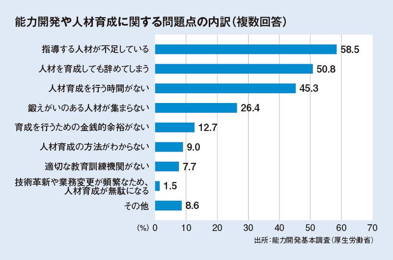 OFF‐JTを実施した企業の教育訓練機関の種類、つまり誰が実施したかは、「自社」が最も多く78・2%。これに次いで民間の教育研修会社などが43・5%だった。自社で実施できれば安上がりだが、適任者がいるかが問題だ。実際、「能力開発基本調査」によれば、企業が能力開発や人材育成に関する問題点として最も多く挙げたのは、「指導する人材が不足している」(58・5%)だった。研修の成果はこれを実施する研修講師のスキルに依存するので、品質を信頼できる外部に依頼するのが確実だろう。