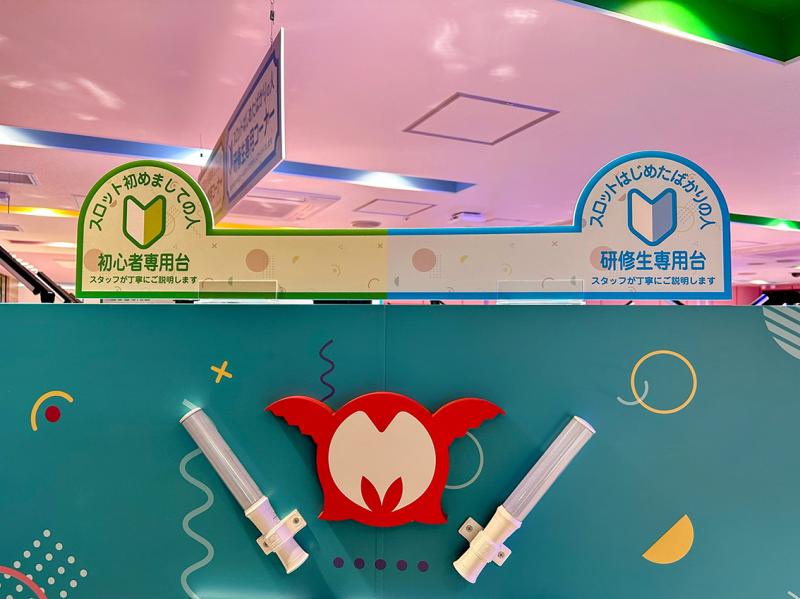 『スロット 推しスロ アイドルバージョン』のフロアはすべて雁行島で、台間をパステルカラーの大きなパーテーションで仕切った半個室空間。長時間遊技でも疲れにくいようにピンクのゲーミングチェアを設置した。