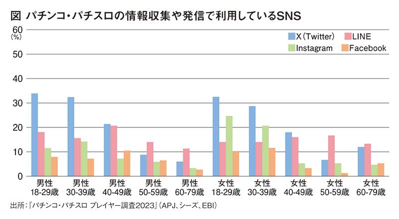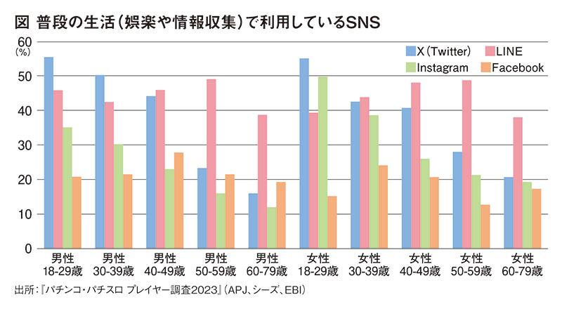 遊技者においてもっとも多く利用されているSNSはLINEで、43.9%が利用。次いでX(旧Twitter)が38.7%、Instagramが25.8%。LINEはメッセージアプリとして幅広い年代で多くの人に利用されているが、SNSとは認識していないユーザーも多いため解釈には注意が必要だ。