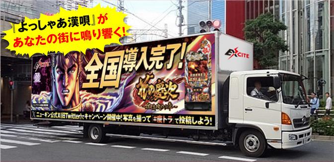 この企画は、2台のアドトラックが「花の慶次」シリーズでお馴染みの楽曲「よっしゃあ漢唄」を流しながら全国の繁華街で走行するもの。15日までの期間に、全国47都道府県すべてを巡る。機種の認知度アップと話題性の醸成を目的としている。