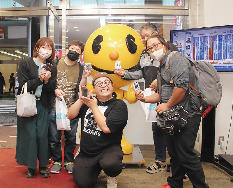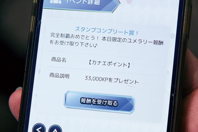 ポイトレはスマートフォンの位置情報を利用したポイントサービス。マイホに登録したホールの協賛店になっている飲食店や公共施設、アミューズメント施設など特定スポットでポイントを獲得できる。この日は『ピーアーク千葉駅前』周辺の飲食店5店舗をやーまんさんとともに巡って、参加者に利用方法をレクチャー。この日限定の「ユメラリー」5店舗のスタンプをコンプリートした報酬として参加者にはアニメのキャラクターが描かれたトレーディングカード(トレカ)がプレゼントされた。