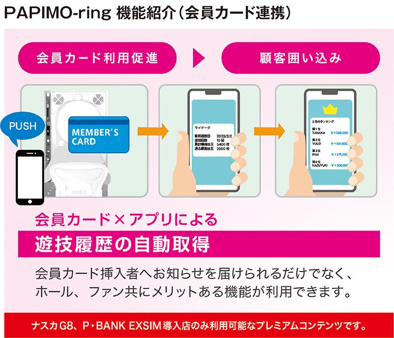 会員管理との連携は、グローリーの会員管理システムとユニットを導入している店舗が利用できる機能で、『PAPIMO‐ring』で得たデータは、ホールが専用のダッシュボードで閲覧可能。来店推移やプッシュ通知配信機能などを分析できる。