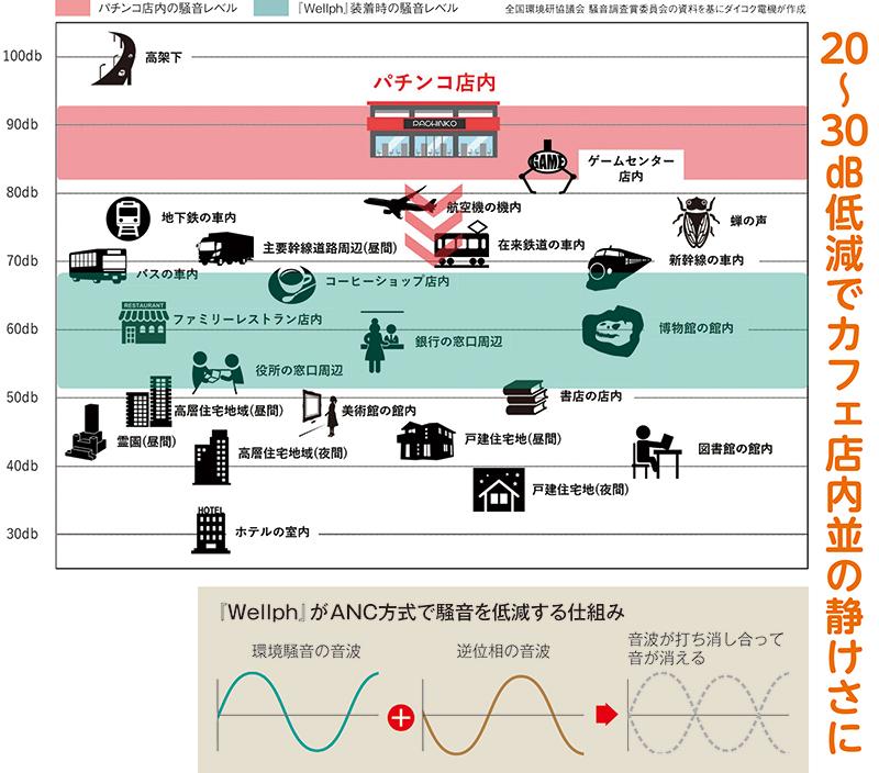 ホールの騒音レベルは80〜90㏈前半で、電車や航空機の中にいるときよりも騒がしい。最近は、耳に大きな負担をかける労働環境からスタッフを守ることが、健康管理や人材採用の面からも重要視されている。こうした課題を解決してくれるのが、ダイコク電機のノイズキャンセリングイヤホン『Wellph』だ。