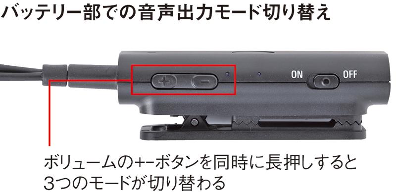 ダイコク電機はスタッフ保護の観点から、イヤホンの両耳装着を推奨している。両耳装着時でもファンの声を聞き逃さないように、音声出力モードの切り替え機能を搭載。ボリュームボタンの同時長押しで、「両耳⇨左耳⇨右耳⇨両耳…」の順に切り替わる。