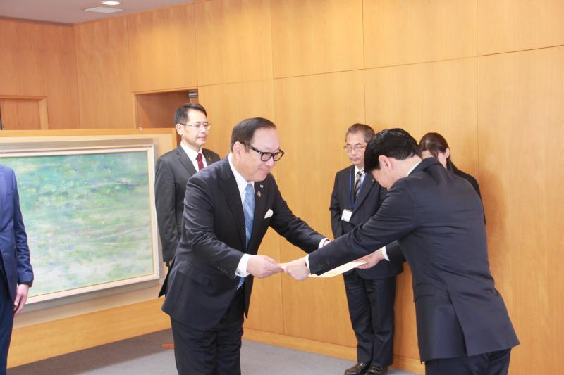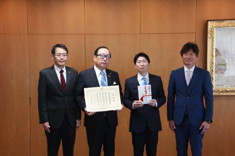当日は千原理事長が「組合員の思いがこもった浄財を社会のために役立てて」と寄付金を手渡し、伊原木知事からは「永年にわたり歳末のこの時期に多額の寄付をいただき、ありがとうございます」と感謝状が手渡された。