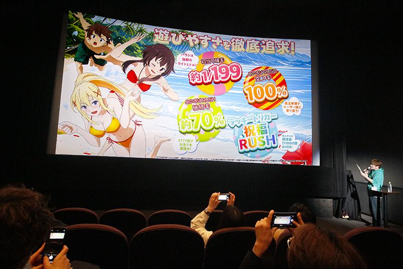豊丸産業は1月11日、アクアシティお台場(東京都港区)のユナイテッド・シネマ アクアシティお台場で、ラッキートリガー搭載のパチンコ新機種「Pこの素晴らしい世界に祝福を!『このラッキートリガーに祝福を!』」のプレス向け説明会を開催。映画館のスクリーンを貸し切っての説明会には多くのプレス関係者が集まった。