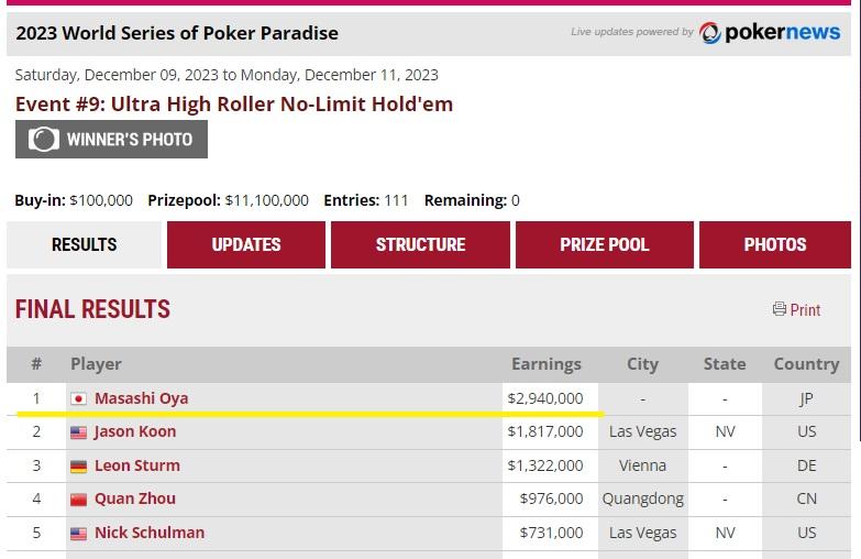 昨年12月、「日本のポーカー史が動いた」とも言われる大きなできごとがあった。バハマで行われていた世界最大のポーカー・トーナメントシリーズのひとつである「WSOP Paradise」のウルトラハイローラーと呼ばれる部門において、12月12日に日本人プレイヤーのオオヤマサシ氏が見事優勝し294万ドル(約4億3千万円)の賞金を獲得した。同氏が優勝したウルトラハイローラーは世界中の強豪ポーカープレイヤーが集結する、同大会における最高賞金額が設定される部門であり、エントリー料は破格の1500万円(!)。トーナメントの最終テーブルに残ったのは生涯獲得賞金77億円で世界4位のジェイソン・クーン(アメリカ)を含む世界のトッププレイヤー達であった。オオヤマサシ氏はそれら「レジェンド」達と堂々と渡り合い、優勝のゴールドブレスレットを勝ち取った。