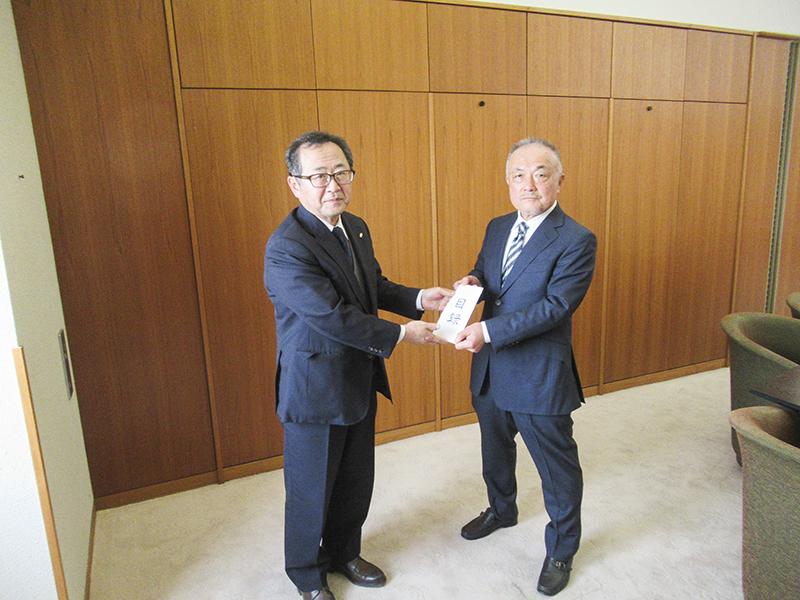 同社で1月22日に寄託式が行われ、森山秀夫理事長が関口雅弘社長に目録を手渡した。