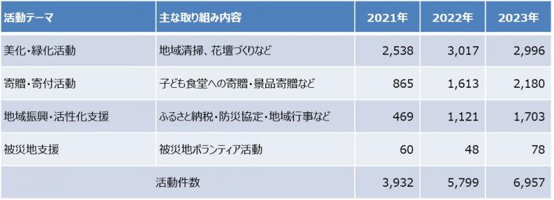 活動の内訳で最も多かったのが「美化・緑化活動」で2996件。次いで「寄贈・寄付活動」の2180件、「地域振興・活性化支援」の1703件、「被災地支援」の78件と続く。昨年は新たな取り組みとして、「魅力発見!三陸・常磐ものネットワーク」に参加。全国37都道府県の子ども食堂125施設に総額263万208円分の「三陸・常磐もの食材」を寄贈した。