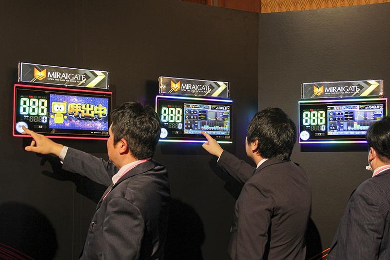展示会場では、製品ラインナップに追加された新製品に多くの注目が集まった。一つ目の新製品は、業界最大・最高画質、13.3インチフルHDの台毎液晶端末『REVOLA Ⅱ』(レボラツー)。スタッフの呼出しボタン以外の部分がすべてタッチパネルとなったほか、高度化するゲームフローのどの状態に遊技者が滞在しているかを示す「ゲームフローナビ機能」を実装した。