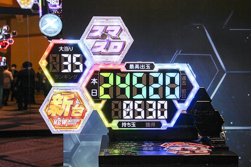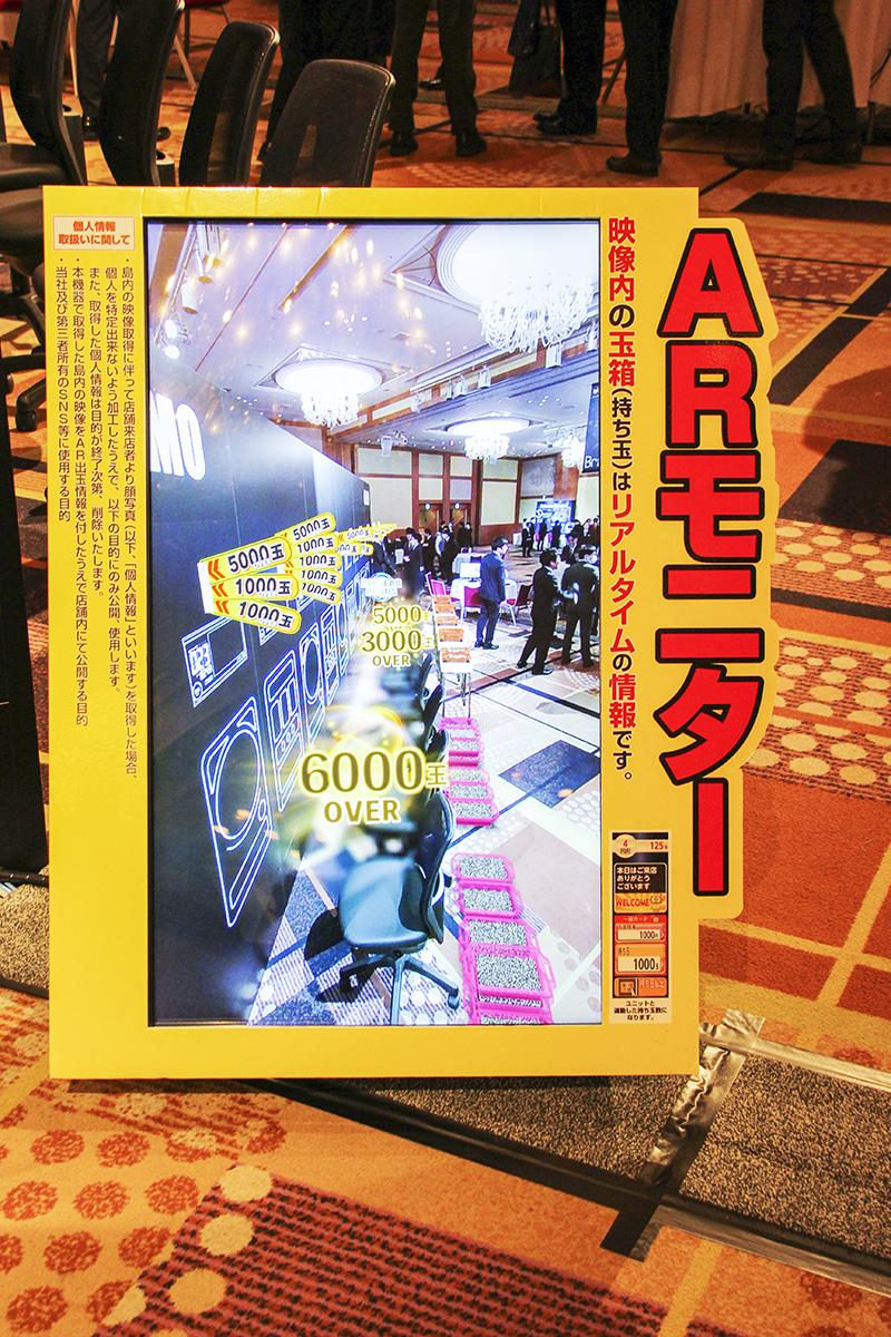 このほかにも参考出品として、出玉感・盛況感を表現するAR玉箱サイネージ『OREMO』(仮称)を展示した。特殊なカメラで撮影した島内のリアル映像に、AR技術による玉箱演出を合成。大型液晶モニターに映し出す。リアルな玉積み以上の表現方法は、来場者の視線を釘付けにした。