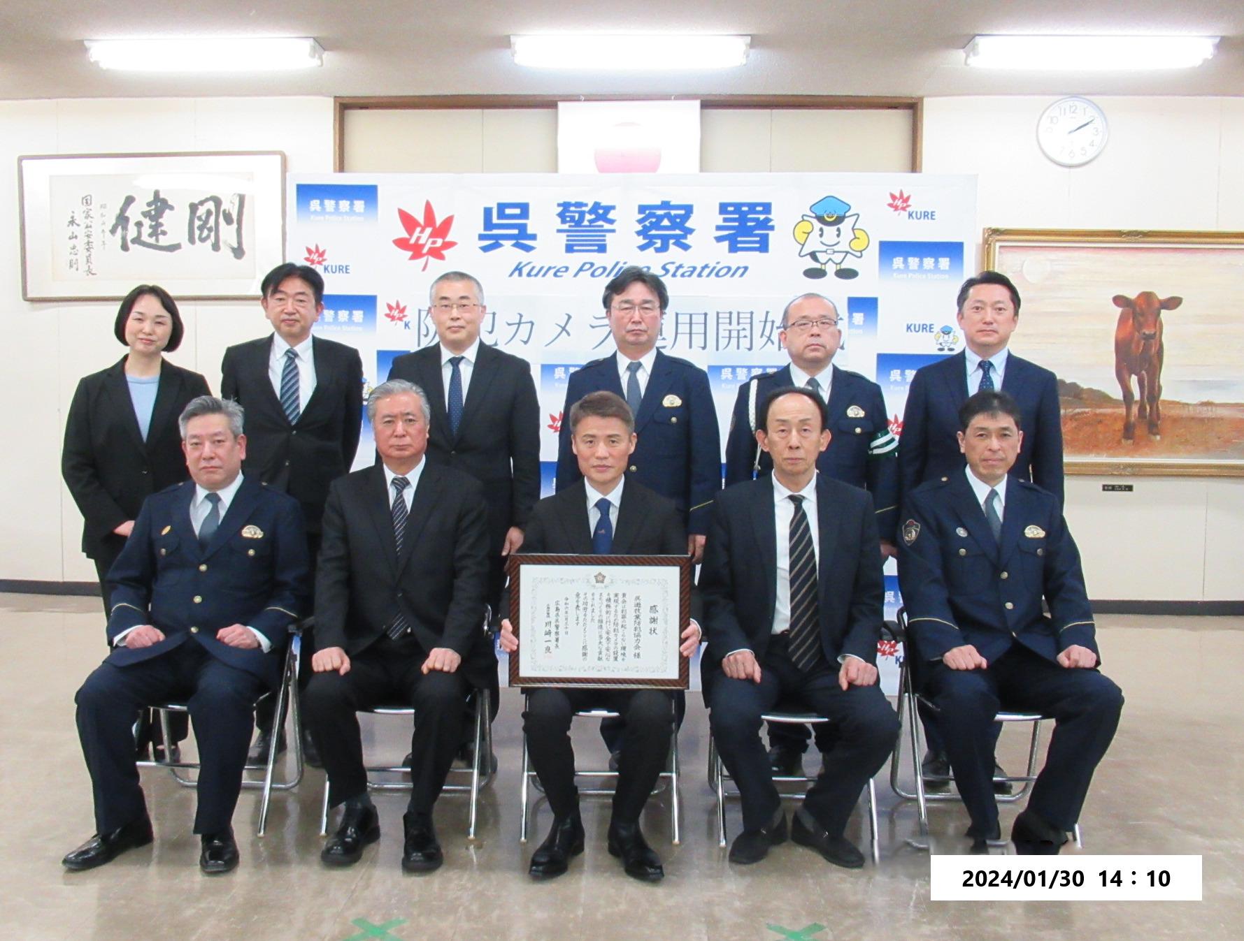 1月30日に行われた防犯カメラ運用開始式には、同防犯協力会から川崎徳来支部長、若狭伸次役員、西川忠男役員が参加。寄贈にあたり、同警察署の川﨑一良署長から感謝状が贈られた。