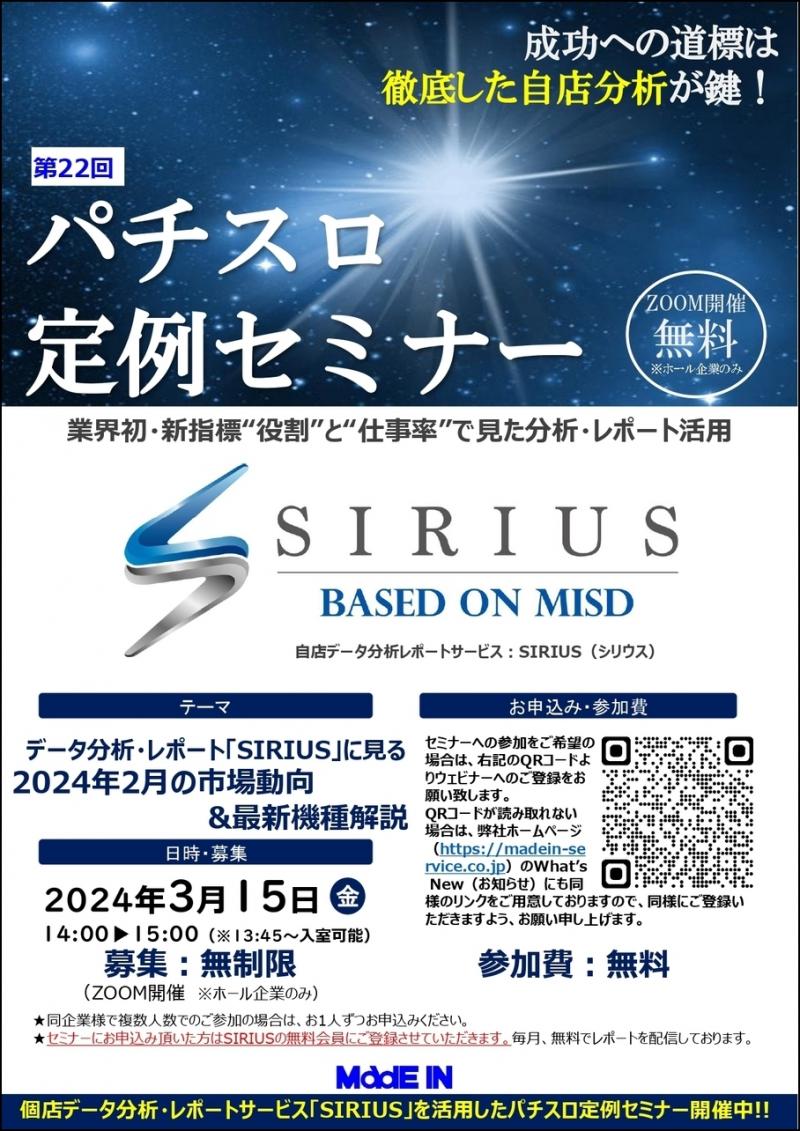 業界初の新指標を用いた自店舗実績データ分析・レポートサービス 「SIRIUS(シリウス)」を提供するメイドインサービス(東京都府中市)は3月15日(金)、第22回パチスロ定例セミナーをオンラインで開催する。