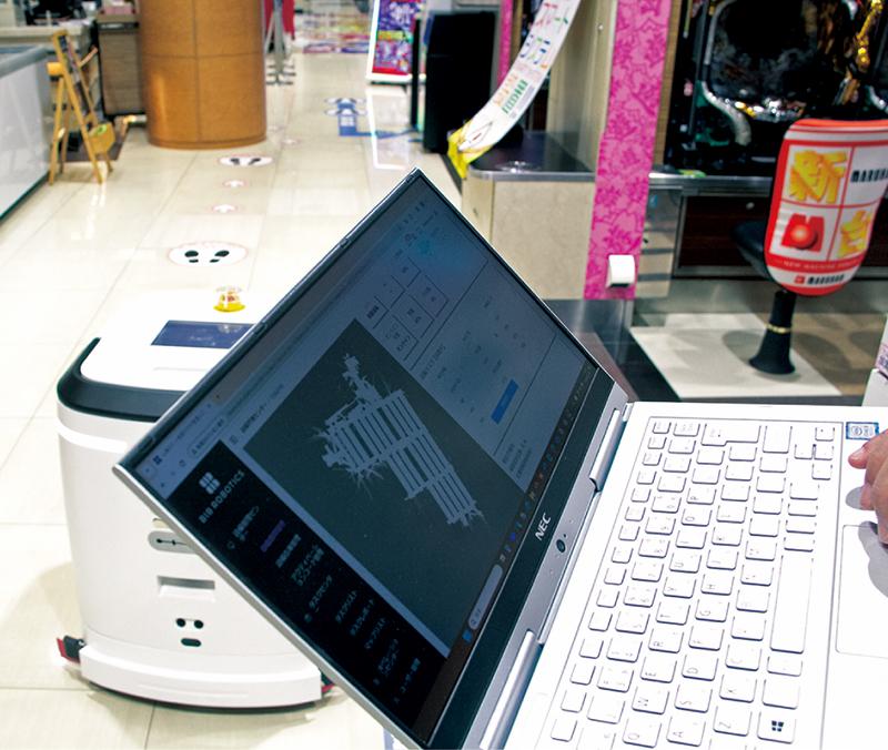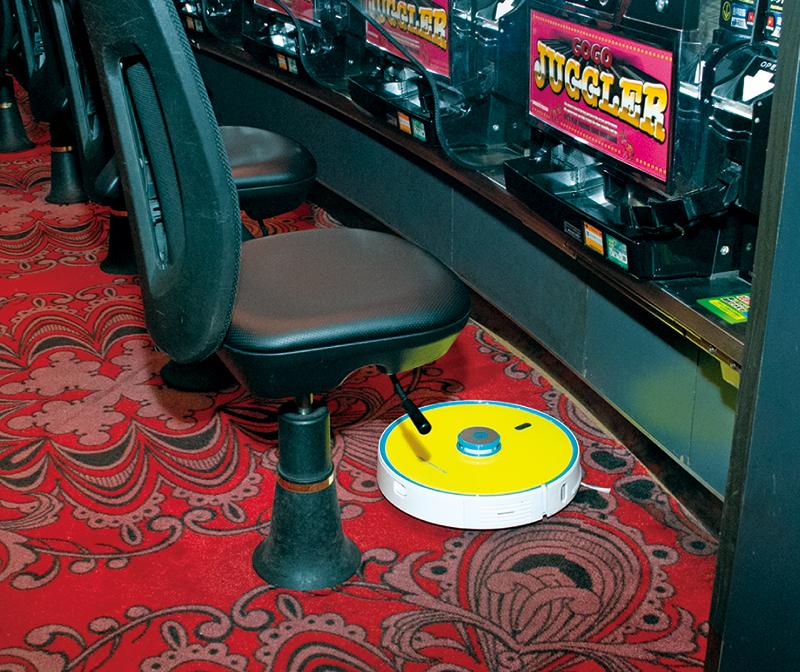 本誌が取材したのは『マルハン蒲田駅東店』(東京都大田区)。1階、2階の2フロアで総台数は1000台。この店舗では「J40」1台で2時間ほどで床清掃を終えている。店内を動き回る「J40」の動きを見ると、狭い島間や湾曲島などもくまなく清掃していた。