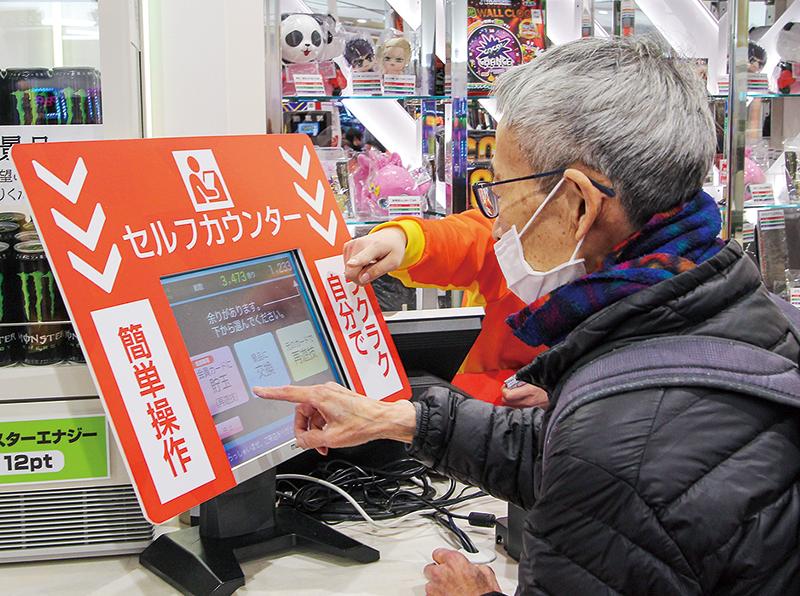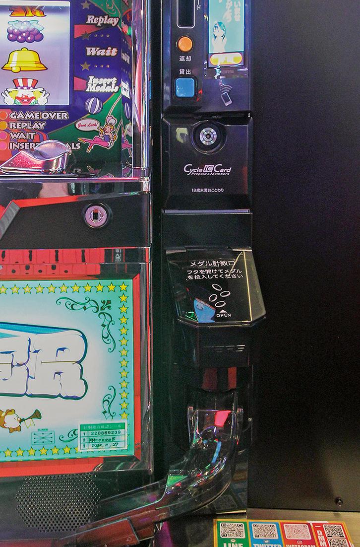『セルフPOS』は景品交換客の8割超が利用するほどに浸透している。1階パチンコフロアでは2台中1台がセルフ。2階パチスロフロアにはセルフ1台がある。メダル機には各台計数機付きのメダル貸し機『メダルパーソナル』を導入しているため、すべてのパチスロ客がカード1枚で台移動から交換まで済ませられる。
