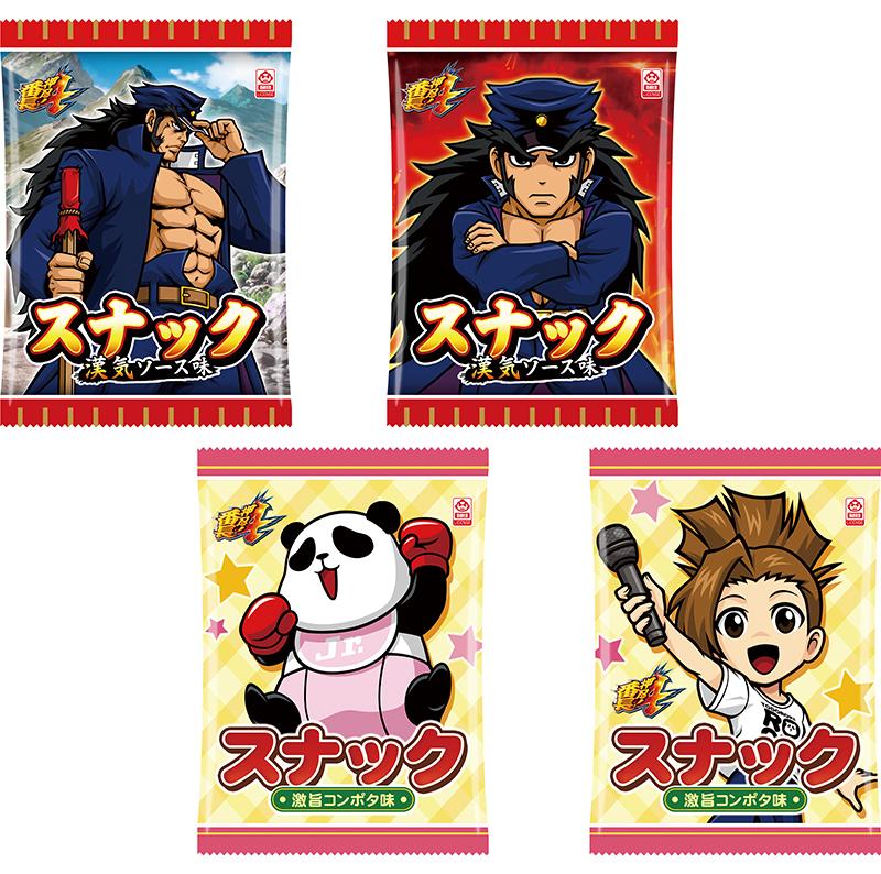 端玉景品として選ばれやすいスナック菓子。味は食欲をそそるソースの風味豊かな漢気ソース味、口いっぱいに旨味が広がる激旨コンポタ味の2種類を用意した。漢気ソース味のパッケージは漢気あふれる主人公の轟金剛、激旨コンポタ味は可愛いコパンダと操がデザインされている。