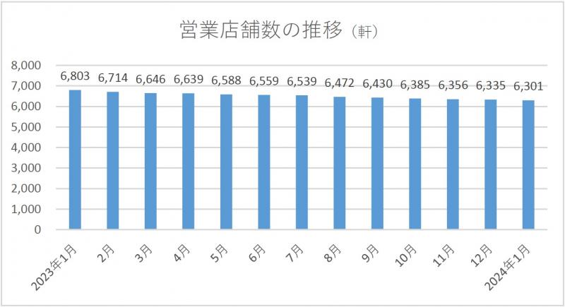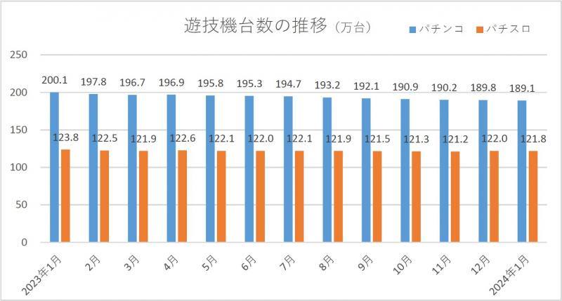 2024年03月13日No.10004202 全日加盟営業店、1月末時点で6301軒 全日本遊技事業協同組合連合会が集計した組合加盟店舗の実態調査によると、2024年1月末時点の営業店舗数は6301軒で、前月より34軒(0.5%)減少した。新規店舗数は10軒、廃業店舗数は40軒、当月中の休業店舗数は25軒。 パチンコ遊技機台数は189万913台で、同6778台(0.4%)減少した。パチスロ遊技機台数は121万8456台で、同1707台(0.1%)減少。その他を含む遊技機総台数は310万9369台だった。 文=アミューズメントジャパン編集部