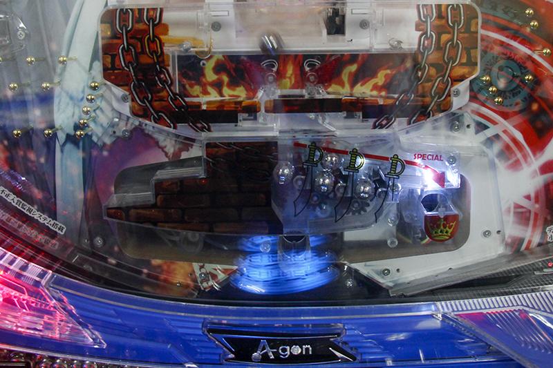 特図2までの道のりには3つの門が立ちはだかる。まずは「第一の門」の黄色上段上皿役物に球を2つ以上乗せる。2つ以上あるときは、下段の赤いチューリップが開放される仕組みになっており、「第二の門」となる中段皿に球を乗せてチューリップに流し込む。チューリップを通過して「最終の門」にたどり着いた球で“球の橋”を作り、橋が崩れないうちにもう一球を流し込むことができれば特図2に直接入賞できるチャンスとなる。