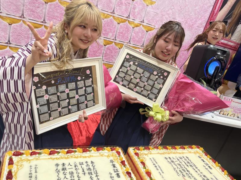 当日、店内に設営された会場には多くの常連客が集まった。卒業式が始まると、棚瀬さんと斎藤さんは袴姿で登場。卒業式では花束と『キクヤ穂積店』のスタッフからのメッセージボードが贈られ、ケーキは集まった常連客にも配られた。最後の挨拶では二人の目に涙が。常連客や一緒に働いたスタッフにこれまでの感謝を伝えた。