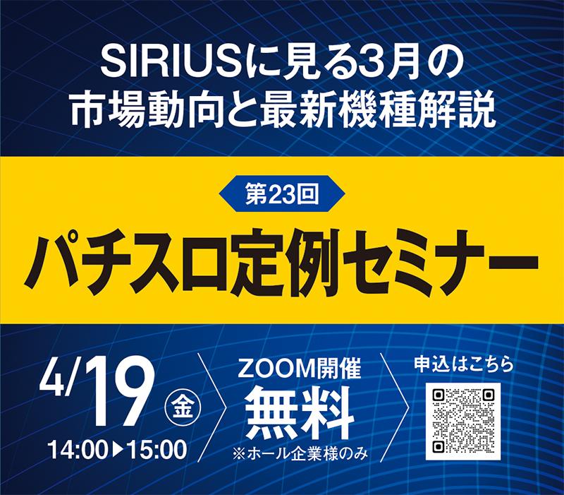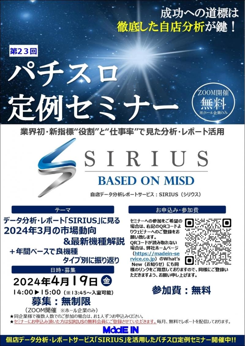 業界初の新指標を用いた自店舗実績データ分析・レポートサービス 「SIRIUS(シリウス)」を提供するメイドインサービス(東京都府中市)は4月19日(金)、第23回パチスロ定例セミナーをオンラインで開催する。