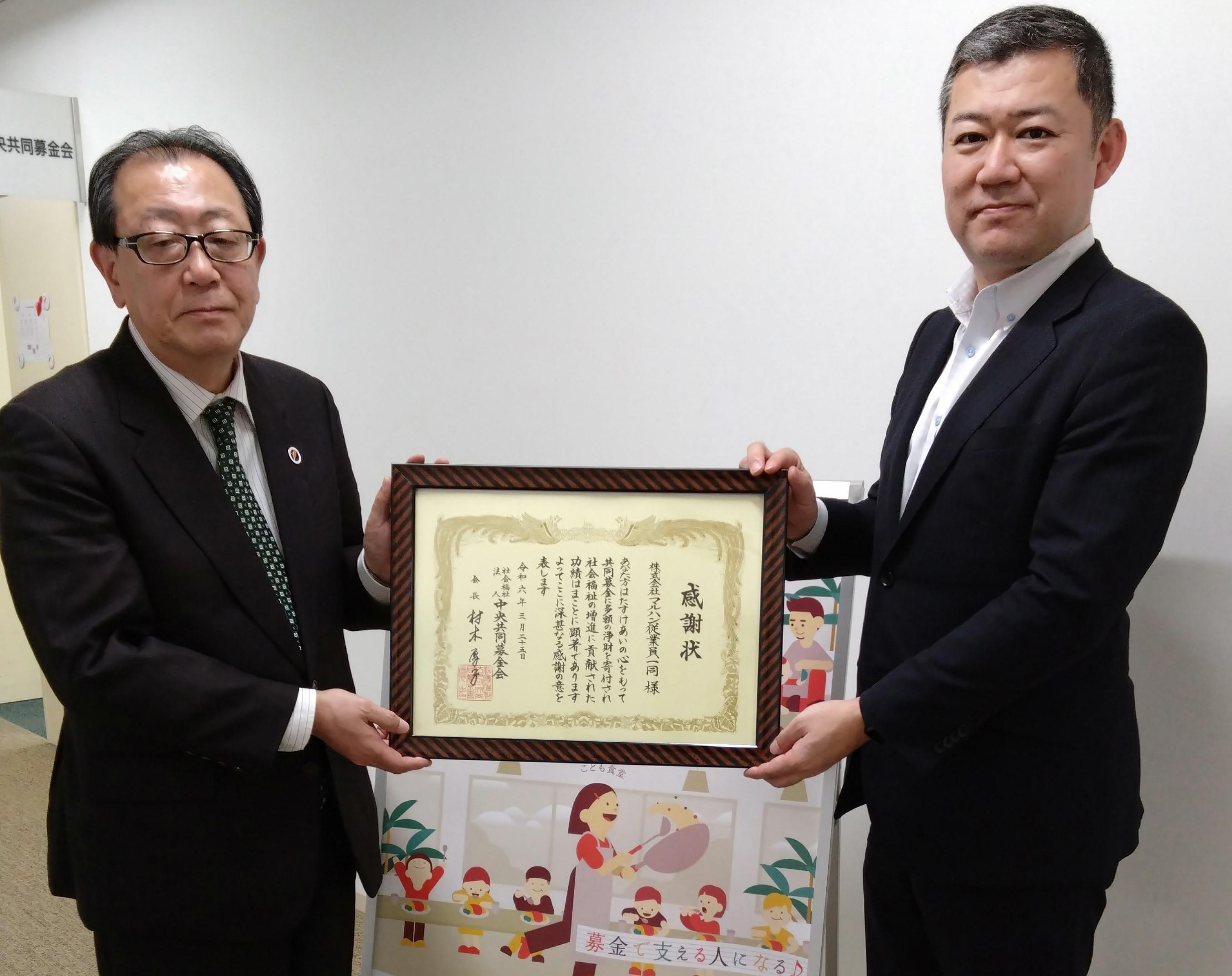 マルハンの従業員は3月25日、赤い羽根共同募金に500万円を寄付。社会福祉法人中央共同募金会から感謝状を贈られた。