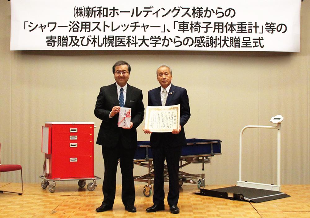 「プレイランドハッピー」の屋号で北海道内にホール20店舗を運営する新和ホールディングス(札幌市中央区)は5月15日、札幌医科大学附属病院に医療機器を寄贈。同日に行われた贈呈式では、同院の山下敏彦理事長から新井修社長に感謝状が贈られた。