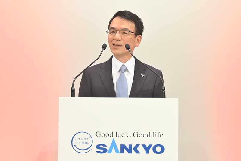 発表会の代表挨拶には専務執行役員の東郷裕二営業本部長が登壇。東郷専務は「初代ユニコーンは多くのファンに遊んでいただき、絶大な支持を得ることができた。その続編を開発するのはなかなか難しいが、ファンの方々のSNSや直接のお言葉に耳を傾けながら開発に取り組んできた。今作は言うなれば『ファンのみなさまと一緒に作り上げてきたガンダム』。歴史に残る大人気のパチンコマシンになってくれると確信している」と後継機の出来に自信を覗かせた。