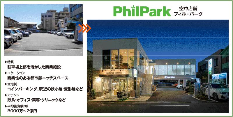 同社が提供するサービス「フィル・パーク」では、主にコインパーキングの上部空間を活かした”空中店舗“を設計・建築し、飲食店やオフィスなどが入居する商業施設として運用する。コインパーキングだけでなく、駅近の狭小地、変形地にも対応している。その事業スキームは2種類ある。