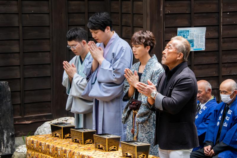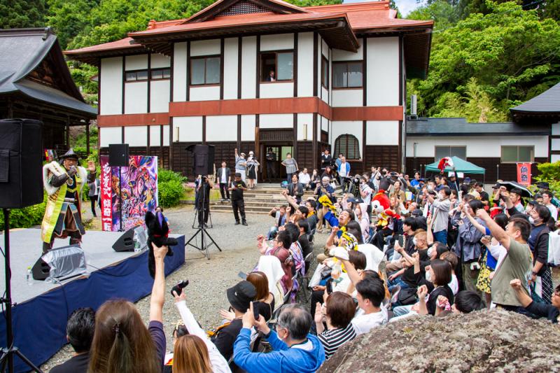今年は新たに建立された慶次の墓石のお披露目と、開眼供養が執り行われた。墓石の「前田慶次郎之墓」の文字は、花の慶次シリーズの楽曲を歌う角田信朗さんが執筆。米沢市の観光大使を務めるなど、慶次に縁の深い角田さんも今回の大役には感慨もひとしおで、「本当にずっしりと重い大役。命を削って書きました」と強い思いを語った。