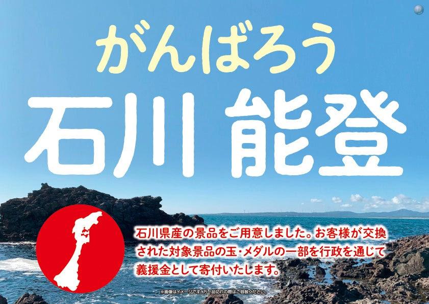 この「がんばろう石川能登」では石川県産の景品を用意し、その景品を交換した玉・メダルの一部を行政を通じて寄付するというもの。6月末には県に寄付される予定。
