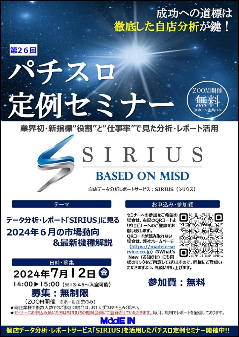 業界初の新指標を用いた自店舗実績データ分析・レポートサービス 「SIRIUS(シリウス)」を提供するメイドインサービス(東京都府中市)は7月12日(金)、第26回パチスロ定例セミナーをオンラインで開催する。
